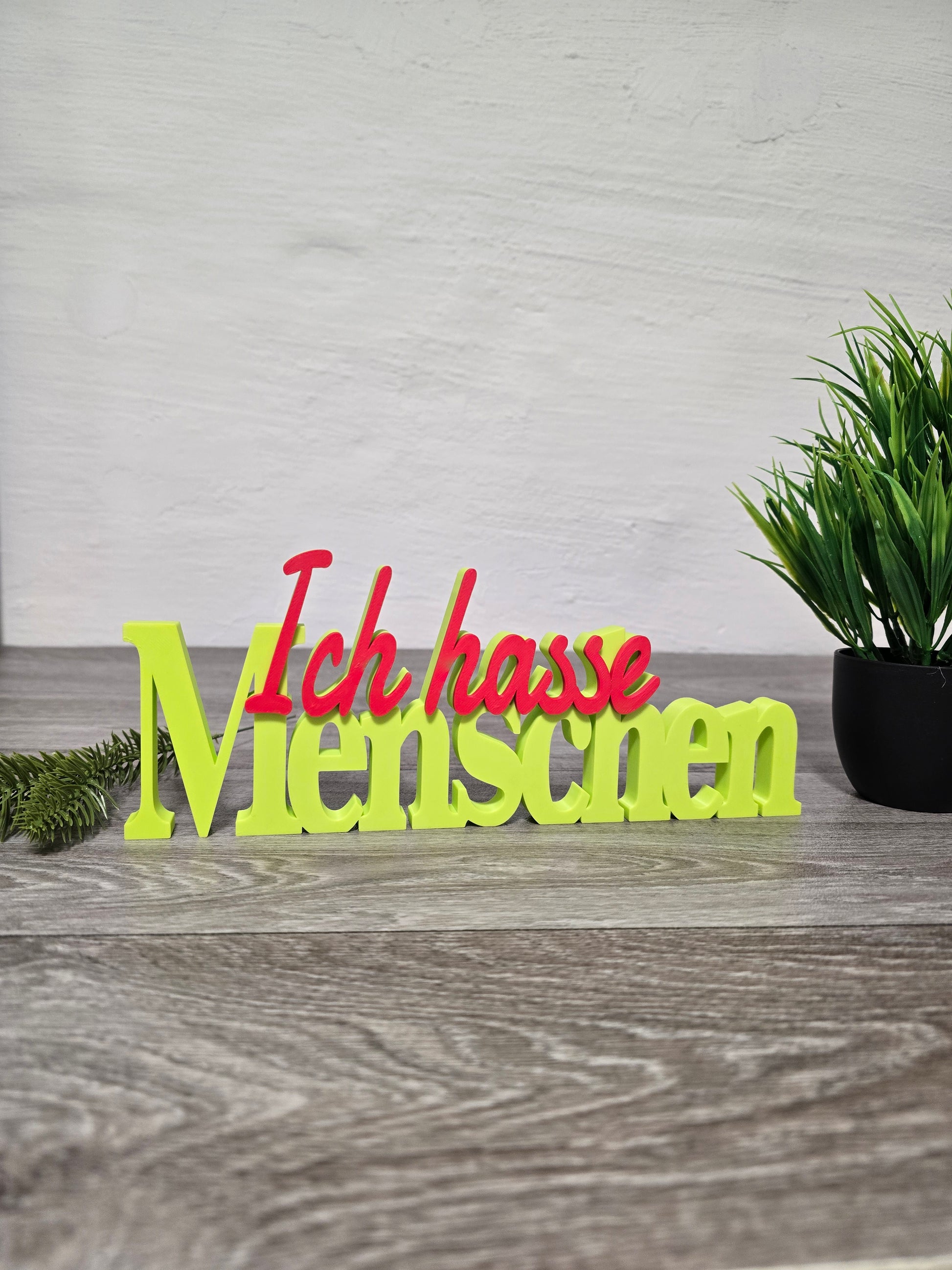 Moderner Schriftzug mit der provokanten Aussage "Ich hasse Menschen" – das perfekte Accessoire für alle, die ihren Sarkasmus und ihre Individualität ausleben möchten. Dieses zeitgenössische Dekoelement besticht durch klare Linienführung und minimalistisches Design, das sich nahtlos in moderne Wohnräume, Büros oder Kreativstudios einfügt. Der Schriftzug setzt ein humorvolles Statement und dient gleichzeitig als Gesprächsstarter. Ideal für Fans von ironischer Dekoration und unkonventionellem Humor, die ihre Persönlichkeit durch ihre Einrichtung ausdrücken möchten.