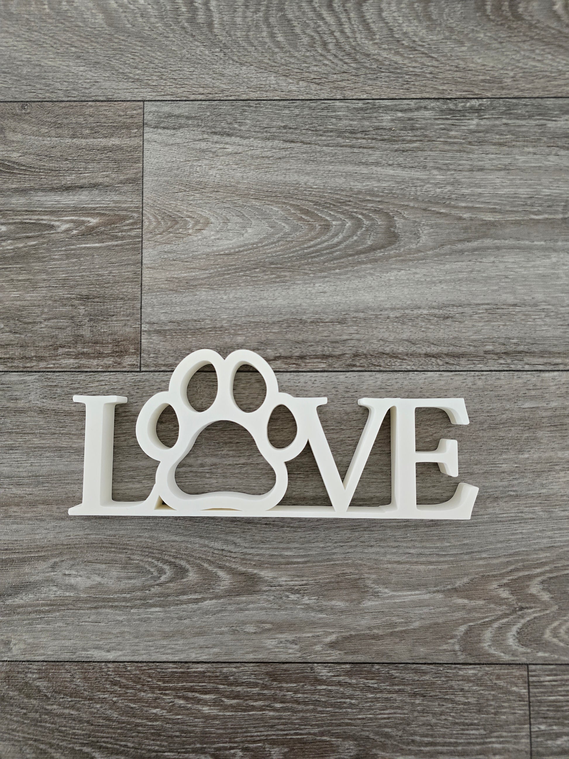 Love Schriftzug mit Pfote – eine moderne Dekoration für Tierliebhaber. Das zeitgenössische Design kombiniert elegante Typografie mit einer Hunde- oder Katzenpfote und schafft eine persönliche Note in jedem Raum. Die schlichte, minimalistische Gestaltung passt zu verschiedenen Einrichtungsstilen und unterstreicht Ihre Leidenschaft für vierbeinige Begleiter. Ideal als Geschenk oder zur eigenen Raumgestaltung.