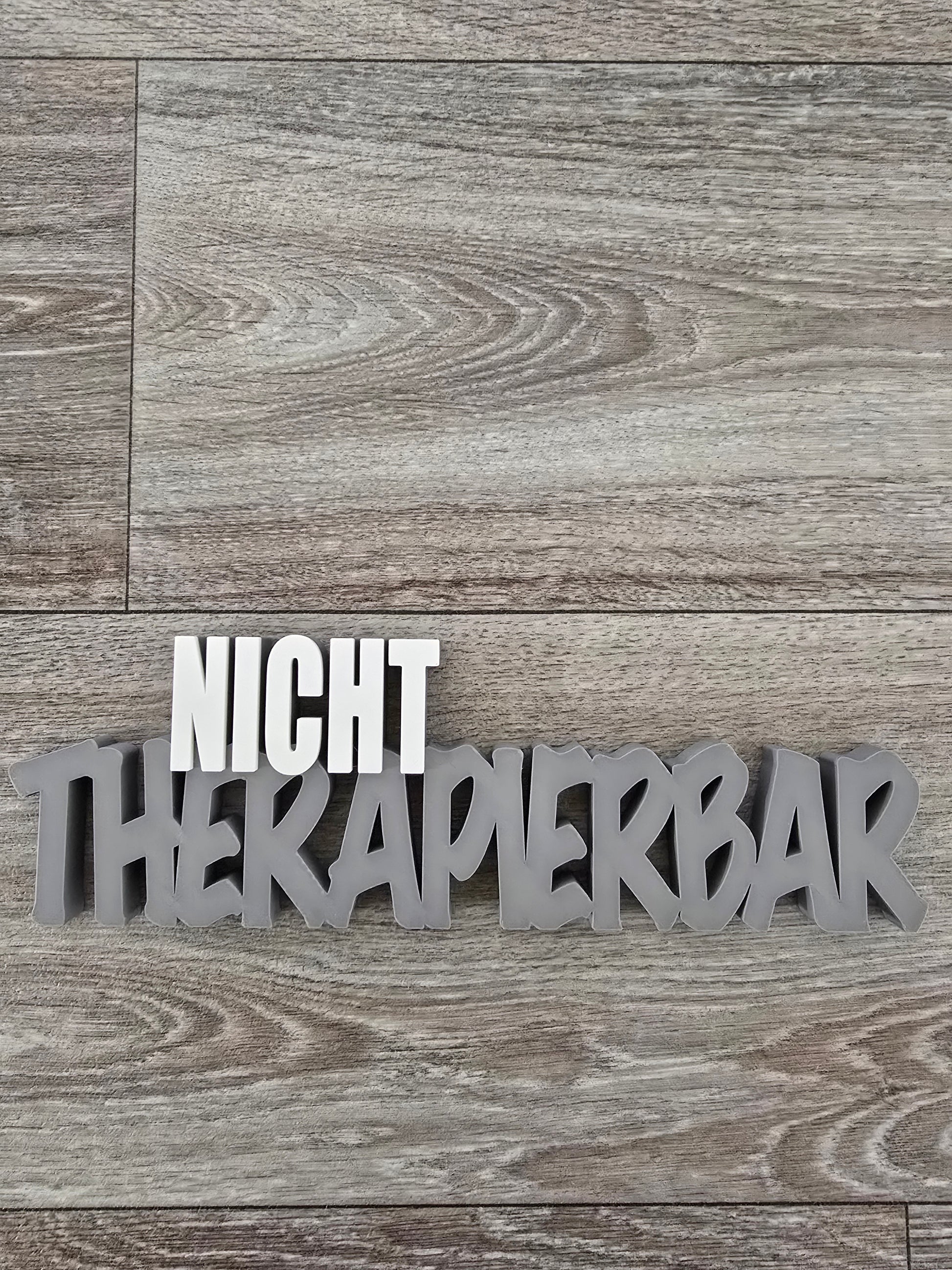 Moderner Schriftzug "nicht therapierbar" – das perfekte Accessoire für alle, die Humor und Selbstironie lieben. Dieses zeitgenössische Dekoelement bringt Persönlichkeit in jeden Raum. Mit seinem klaren, minimalistischen Design passt der Schriftzug zu verschiedenen Einrichtungsstilen und setzt ein humorvolles Statement.